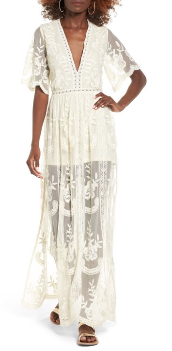 2) Socialite Lace Overlay Romper, $111: We are liking the soft ivory hue of this subtly sexy romper, which is detailed with an intricate sheer lacy overlay. The white shorts underneath reveal a hint of leg, while the airy sleeves and V-neckline emphasize the ethereal, flowing style.