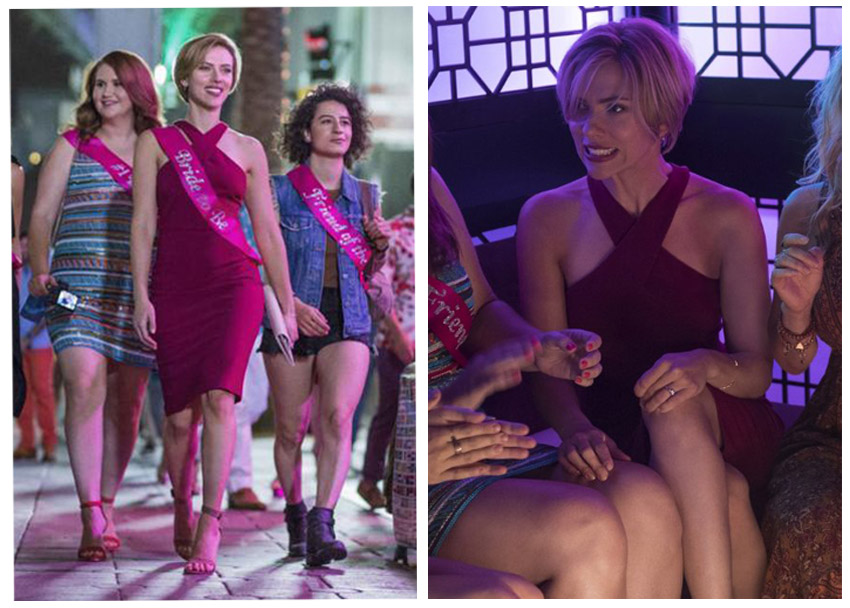 In the new comedy film Rough Night, Scarlett Johansson stars as leading lady Jess. The blond bombshell actress plays a bride-to-be, who embarks on a wild bachelorette party adventure with her best friends and bridesmaids. Although we can probably expect some wild antics from the movie, we’re equally captivated by Jess’ killer style. Johansson’s effortlessly chic character looks gorgeous in this fitted burgundy halter dress, which emphasizes her trim figure. We’ve curated three inspired looks which just may let you steal her style for your own summertime shenanigans.