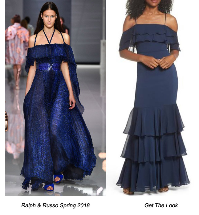 The eveningwear collections this season have been feeling the blues, with all shades from pastel to electric making an appearance. At Ralph & Russo, this delicately pleated, bright blue maxi was decorated with a ruffled, off-the-shoulder neckline and barely there straps. To steal the look for your own special occasion, we suggest this similar navy WAYF Lauren Off the Shoulder Tiered Gown, $227.