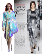 trousers. The addition of pointed shoulders and sleek, futuristic fabric added an edgy finish to this power suit. Tom Ford took the look to rock and roll heights, with sequins and a shawl collar. At Sies Marjan, the metallic silver topper made a grand entrance in the form of an iridescent trench coat with waist-cinching belt. Whether you are layering up for the office or for a night on the town, this trend is sure to make you shine.