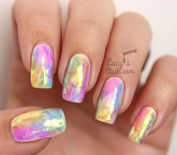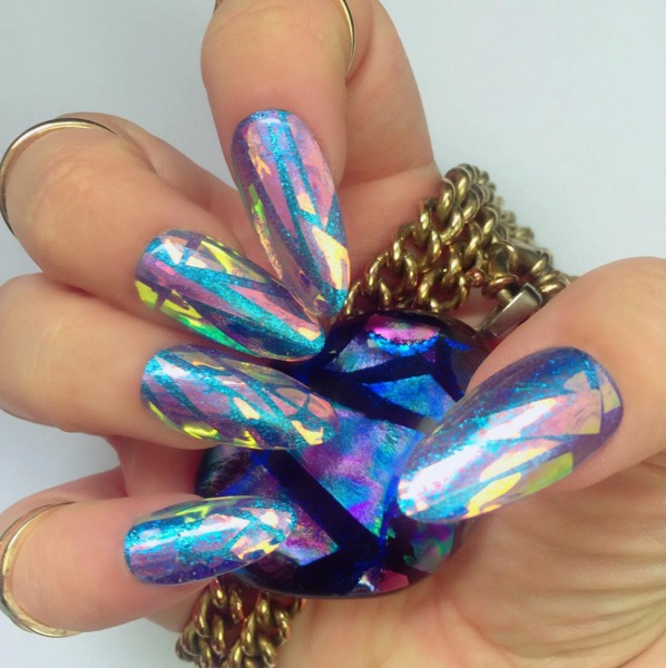 Similar to shattered glass nails, opal nails are inspired from the gemstone opal, giving your talons an iridescent and prismatic effect. To achieve this jeweled look, sheer coats of green, yellow, blue, purple and pink are layered on top of thin film strips and glittery nail polish to create a rainbow pearlescent finish.