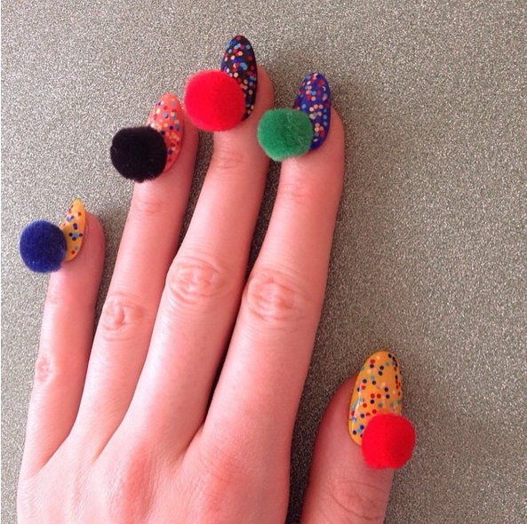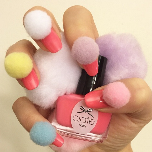 With every colour of the rainbow on display, the pom-poms are glued to the nails in the same way that gems or decals would be. In fact, some mani maniacs are even taking the trend one step further, with tiny gems and brightly coloured nail polish to allow the pom-poms to stand out.