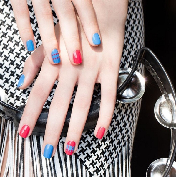 Brilliant red and blue tips with striking dots: Meanwhile, the rising temperatures and the arrival of springtime sunshine may leave you in the mood for punchy colours. Transform your everyday pastel manicure into a party-ready statement, using vivid shades of blue and red. Take your inspiration from this OPI nail art idea, which starts off with a double coat of OPI’s bright red She’s a Bad Muffuletta! shade. Decorate alternating fingers on one hand with this shade, and then apply china blue Rich Girls & Po-Boys polish on the other fingers. Use nail striping tape to create a grind inspired effect, and then apply drops of the contrasting nail polish hue to a single finger. Use a dotting tool to bring a finishing touch to your manicure, and lock your nail art in place with a clear top coat.
