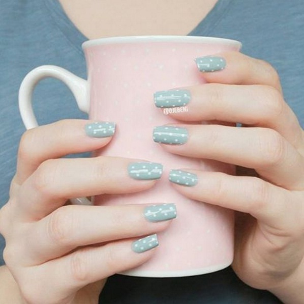 Pastel blue with dainty white polka dots: For beauty addicts who are in the mood for feminine hues, polish your nails with a powder blue base coat. To instantly achieve a striking effect, use a snow-white nail lacquer and a dotting tool to craft the perfect polka dot manicure.