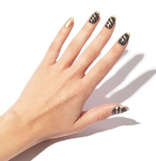 Dark grey fingernails with stripes of metallic gold nail colour: For a glamorous take on metallic fingernails, try painting your nails with a dark grey shade (such as What Time Isn’t It). Next, accessorize your fingernails with zig-zag stripes of gold glitter polish. For a striking effect, paint a single nail with the same gold shade to create a maximum impact.
