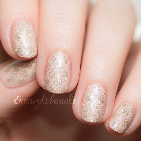 Adorn your nude fingertips with patterned gold accents: If you prefer simplicity, use a natural-looking shade (such as Zoya’s cream-coloured Chantal colour) as your main coat. Next, create delicate and subtle diagonal sections of gold, using a shade such as Zoya’s champagne silver Tomoko). The contrasting patterns help to bring the neutral shade to life, and add a feminine finishing touch.