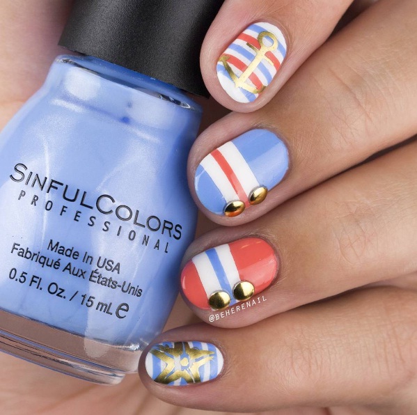 Use shades of periwinkle, white, gold and coral: Try incorporating the season’s gorgeous pastels into your manicure statement, with dainty stripes of white, light periwinkle and coral in varying widths. Meanwhile, use gold nail studs, tiny painted anchors and a quirky golden star for a funky finishing touch.