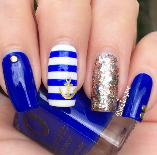 Create a striking manicure with royal blue, white stripes and glitter: With beautiful cobalt and royal blues setting the mood for a journey across the seas, adorn long fingernails with a deep blue shade. Use gold studs to accentuate the rich colour, and then paint your middle fingernail with contrasting stripes of blue and white. Add a golden glitter anchor at the corner of the nail, and then accent another fingernail with a pop of metallic blue and gold polish.
