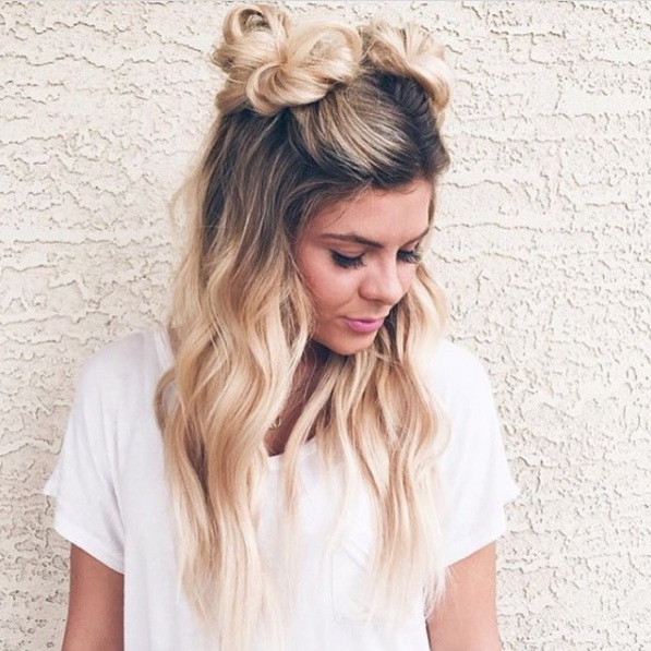 Double buns are now styled with highlighted blonde locks, with flowing locks and textured strands bringing an update to this throwback hairdo.