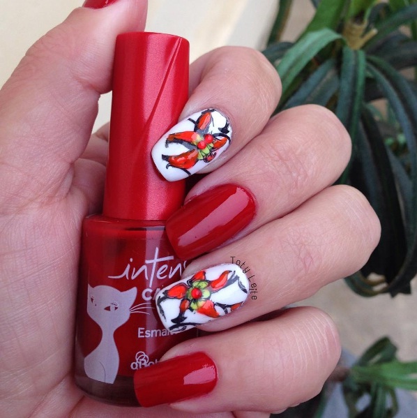 Combine gleaming red fingernails with beautiful blooms: To achieve stunning talons, paint alternating fingernails with a brilliant shade of Aurora Red. Meanwhile, decorate every other nail with black, white and red floral nail art. The contrasting effect helps to maintain visual interest, while the tiny blossoms are sure to flatter your fire engine red tips.