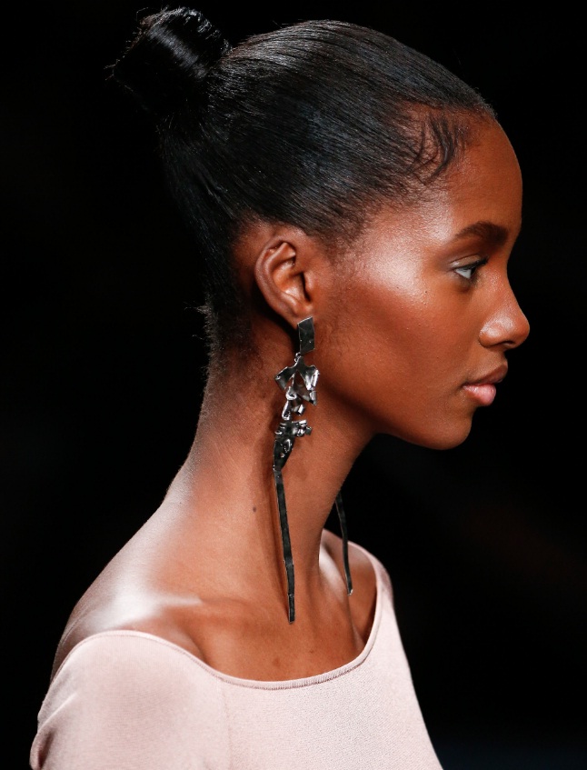 The knot also staged a comeback at Valentino, where locks were styled into high, fierce buns. The look of flawlessly swept-back hair helps to showcase your visage and emphasize your cheekbones. As an added plus, a smooth high bun also ensures that pesky, thick strands will stay out of your eyes and remain in place.
