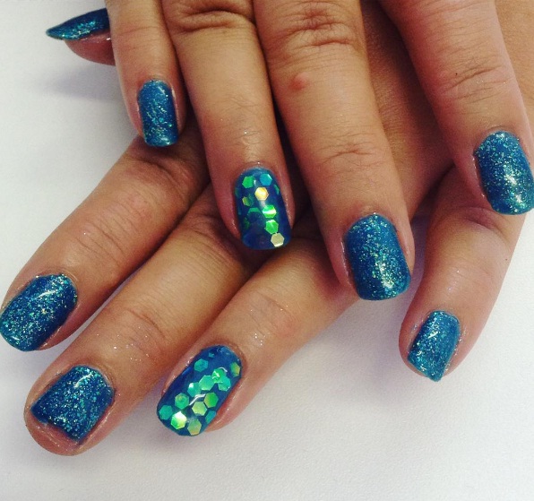 Take your cues from the mermaids: Summer may be a distant memory at this past, but that doesn’t mean that mermaid nails have become uncool. If you’re wondering how to bring shimmer to your fingertips, decorate your talons with shimmery turquoise or aqua nail polish. Meanwhile, accenting a couple of fingertips with green sequins can help to polish off your nails.