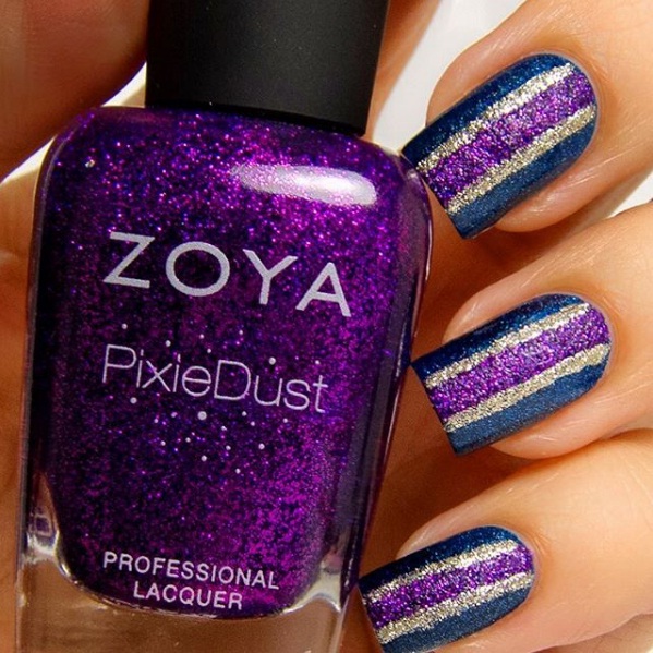 Accent your nails with contrasting stripes of navy blue, violet and gold: If you’re a fan of bold colours, try adorning your fingertips with contrasting metallic and jewel tones. Take your cues from this Zoya manicure, which involves intersecting stripes of violet, dark blue and shiny gold. The eye-catching vertical stripes create a structured look, while the fierce glitter truly sets the stage.
