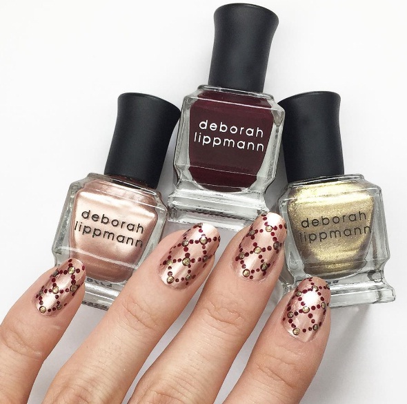 Adorn your nails with rose gold, cranberry and gold: For a truly festive manicure, look no further than rose gold nails decorated with intersecting dots of cranberry and shiny gold (as seen at Deborah Lippmann). The warmer colour palette and the metallic detail contrasts beautifully, and also captures the beauty of the season.