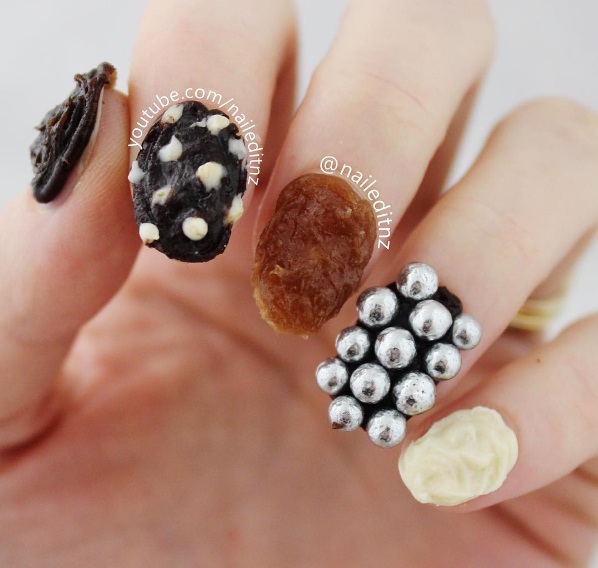 Mills’ nail art look involves actual chocolate icing, which is used to create the look of dark brown nail polish. Afterward, the chocolate-covered nails are accented with silver faux pearls for an eye-catching and surprisingly chic effect.