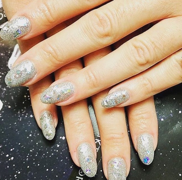 Bedazzled nails are staging a comeback in all manner of sparkly versions, with decorated silver fingertips also leading the way. With an elegant almond shape, the look of iridescent bedazzled tips can certainly light up the dance floor on a weekend.