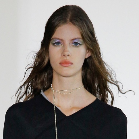 Although blue shades certainly evoke the 1980s, Jill Stuart turned to shimmery lavender for a pop of springlike colour. Iridescent eyeshadow instantly illuminated the eyelids, with darkly outlined eyes offering a beautiful juxtaposition.