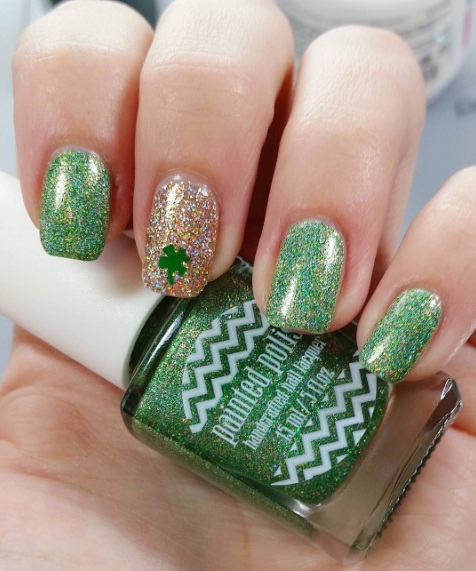 Combine sparkling shamrock green with punchy metallic polish: For a sparkling manicure, adorn your nails with shamrock-coloured green sparkle polish. Meanwhile, a single statement nail in a metallic gold glitter hue can bring a finishing touch to your entire nail art look.