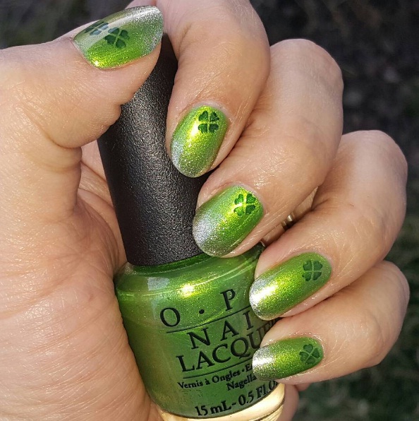 Accent your shimmering green fingertips with tiny four leaf clovers: To truly get into the spirit of the holiday, paint your fingernails with a shimmering yellow green shade of nail polish. Next, accent your nails with tiny four leaf clovers in a darker shade of green. A single clover on each fingernail can easily bring your fingers to life and help you get the party started.