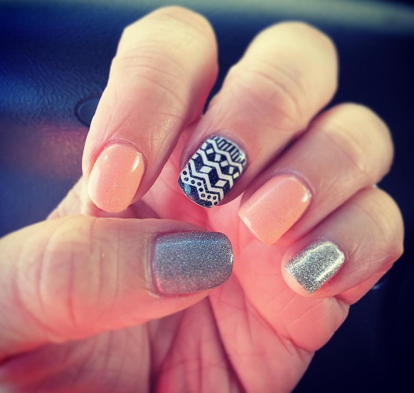 For a bit of visual interest, try contrasting tangerine nails with pink undertones with a black and white printed statement nail. Add silver nails for a sparkling finish, and turn a sunny springtime colour into an eye-catching manicure which is perfect for the evening hours.