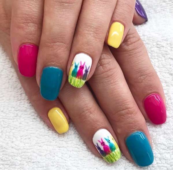 Adorn your tips with funky bunnies and bright shades: For a darker, playful take on the season’s manicure, adorn your nails with vivid shades of fuchsia, cobalt blue, sunny yellow and violet. Meanwhile, white-painted nails detailed with tiny, rainbow-coloured bunnies can usher brightness into your nail look.