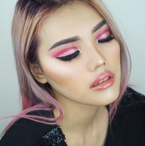 If you’re uncertain of the trend, try layering your darker pink eyeshadow with a lighter pink option, to create a pretty monochromatic look. Meanwhile, dramatic long eyelashes, contoured rosy cheeks and a precious pink pout can complement the pink colour palette of your makeup look.