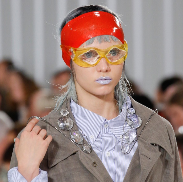 Icy lavender made a grand appearance at Maison Margiela, where avant garde vibes were the look of the day. A touch of shimmer brought a frosty touch to the lipstick statement, which can offer a change from a no makeup look. Whether you decide to turn up the glamour factor with defined smokey eyes or allow the sparkling pale purple lips to speak for themselves, this is a colour choice for the true beauty rebel.
