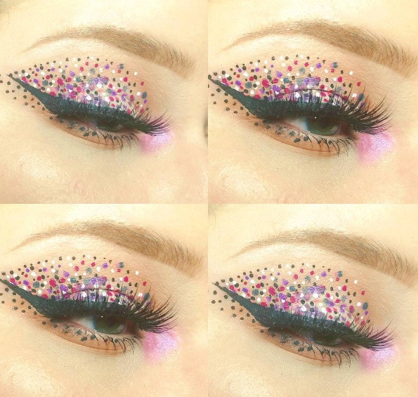 If there’s a birthday party on your social calendar, you can also turn up the glamour factor with rainbow-coloured confetti eye makeup. Accessorize a stripe of inky liquid liner with purple, pink and red dots spread across your eyelids. Whether you’re ready to party or simply soaking up the makeup trends of the season, your newly adorned lids are sure to make a bold first impression.