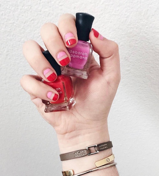Colourblock with shades of pink and red: For an eye-catching approach to the typical solid manicure, try bringing your nails to life with bold horizontal sections of pink and red. This Deborah Lippmann look captures the colourblocking and negative space trends perfectly, with its bright tones and unpainted sections to break up the colours.
