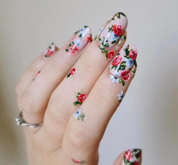 Think vintage florals: Far more from being kitschy or childish, a vintage inspired floral nail art can bring your manicure to an entirely new level. Try painting your almond-shaped tips with a nude polish, and then painting gorgeous blooms over the neutral colour. Shades of pastel blue and bright green with red roses offer a romantic, fairytale feel.