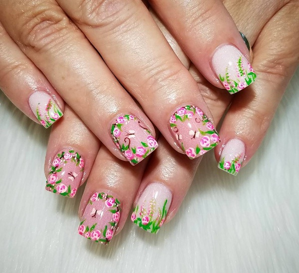 Decorate with blush hues: There’s nothing quite like pretty pink nails for the summer months, and a floral blush manicure can easily leave you feeling like a princess. Decorate your square tips with shimmery pale pink polish, and add intricate pink florals for a sweet garden-like vibe.