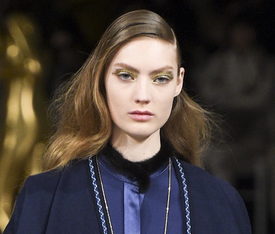 Alexis Mabille experimented with an intense gold smokey eye, which was smudged at the corners and featured a heavily shadowed lid. With the addition of bold brows, flawless skin and a nude lip, this approach to gold eye makeup was surprisingly wearable. Meanwhile, Nicholas K paired the slightly sparkly gold eye with dewy skin, slightly rouged cheeks and glossy lips.