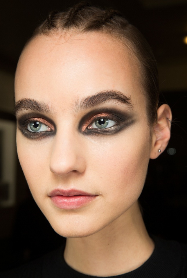 For an intense, brooding eye makeup look, turn to the beauty statement on display at Balmain. Try outlining your lower eyelids with shimmering dark shadow, and then enhancing your upper eyelids with dark coppery shadow and swirls of dark grey or black. Meanwhile, smooth skin and bold brows further enhance your makeup look.