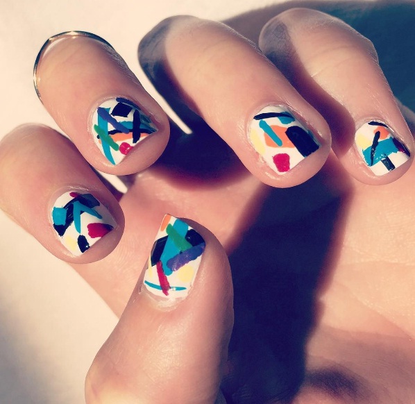 Think slashes of bright colour: If you’re feeling the colourful rainbow vibes of summer, consider painting your fingertips with an array of vivid tones. Start off by polishing your fingernails with white polish, and then accent the nail polish with an explosion of bright colours. Abstract stripes and splashes of blue, violet, yellow and orange can instantly brighten your fingertips.