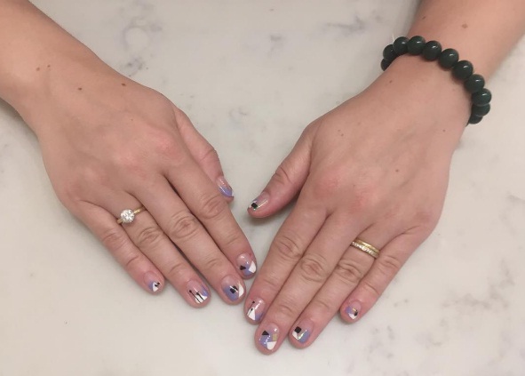 Consider lavender and white colours: For a contemporary set of talons, accent your fingernails with asymmetrical white and pale purple geometric shapes. Meanwhile, the occasional black diamond or square can liven up your talons, with clear nail polish as a base coat.