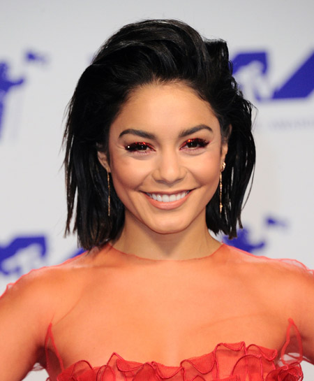 Vanessa Hudgens stepped out with her eyes outlined in glittery red and perfectly matched to her dress. The 28-year-old actress also rocked glowing skin, soft peachy blush and a neutral lip colour. With her raven locks slicked back into a voluminous coif, Hudgens was a vision at the VMAs.
