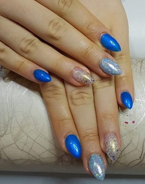 Sparkly blues: Accessorize a few nails on each hand with bright cobalt or royal blue polish, and decorate the remaining fingers with shimmering polish in shades of silver, white and pale blue. The mix of aquatic hues and sparkle evokes immediate mermaid vibes, while sharply filed almond tips only help to complete your nail makeover.
