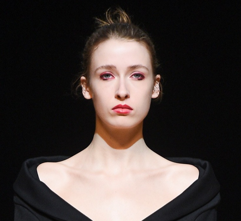 Hussein Chalayan experimented with pink eyeliner, which was blended around the eye area for a brooding, moody effect. To complement the pink-toned lids, rosy pouts and natural-looking eyebrows were also a key look. As a result, the fierce eye makeup seized the attention, and kept the focus on models’ vivid eyelids.