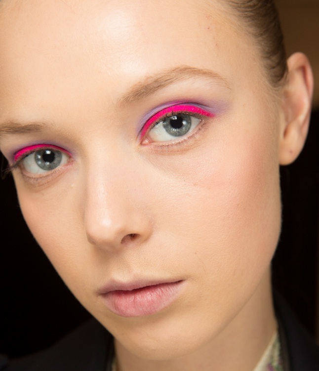 On the runway at Oscar de la Renta, the makeup look was eye-catching and vibrant. Fuchsia eyeliner was layered with pastel lilac eyeshadow, for a softly smudged, colourblocked eye. Meanwhile, bare skin and youthful flushed cheeks completed the overall visage.