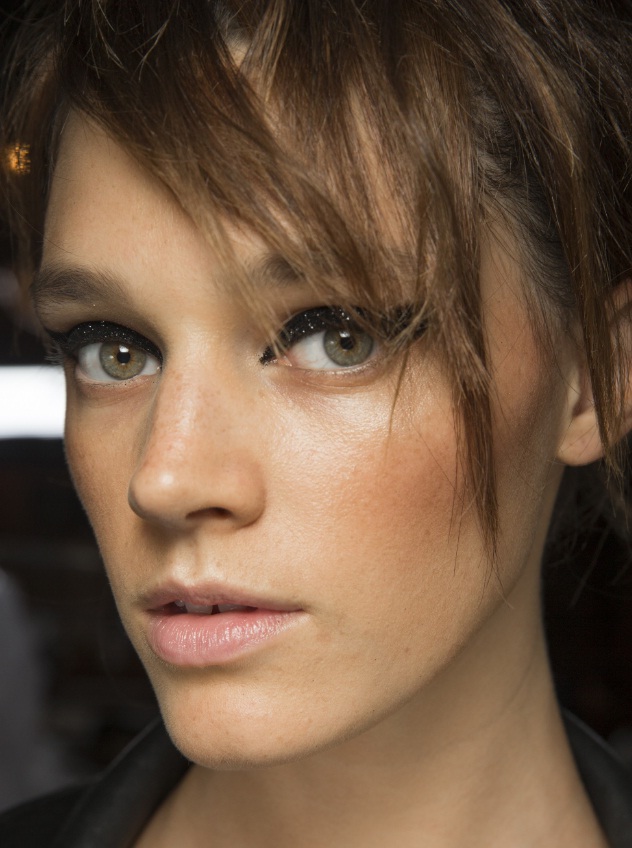 At Tom Ford, eyes were the primary focus. Models sported thick black winged liner on their upper eyelids, accented with hints of glitter. The slightly shimmery eyeliner was contrasted against natural-looking skin, apricot blush and pale pink lips.