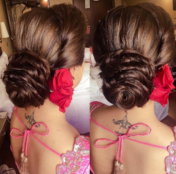 Try a twisted bun: For ladies who have thick, voluminous hair, there’s nothing quite like locks woven into a twisted and woven bun on the nape of the neck. Use bobby pins to hold your newly crafted hairdo in place, and then accessorize with a bright red faux (or real) rose. The slightly Spanish themed style can instantly brighten any dance floor, and is sure to capture the attention of admirers.