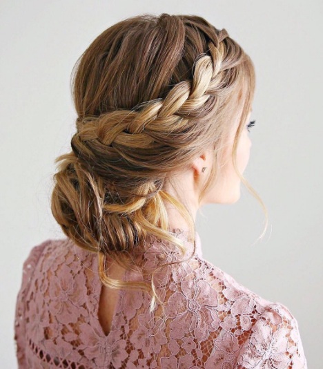 Experiment with braids: We are liking this hairdo, which features an intricate lace braid wrapped around the back of the head. Meanwhile, arranging your locks into a low bun, along with the addition of wispy locks, completes your hair transformation in a few simple steps.