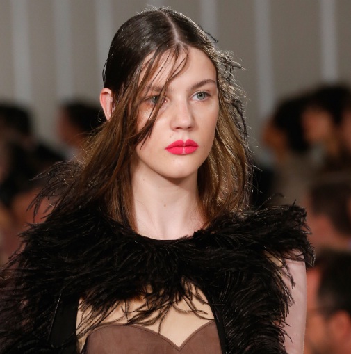 At Maison Margiela, the emphasis was on the lips, and models strut the catwalk with bold pink lips. However, this was no ordinary pout, as celebrity makeup artist Pat McGrath applied the lipstick in a sweet heart formation. The heart shaped lips were paired with minimal makeup, and wet look, slick locks that were pulled away from the face.