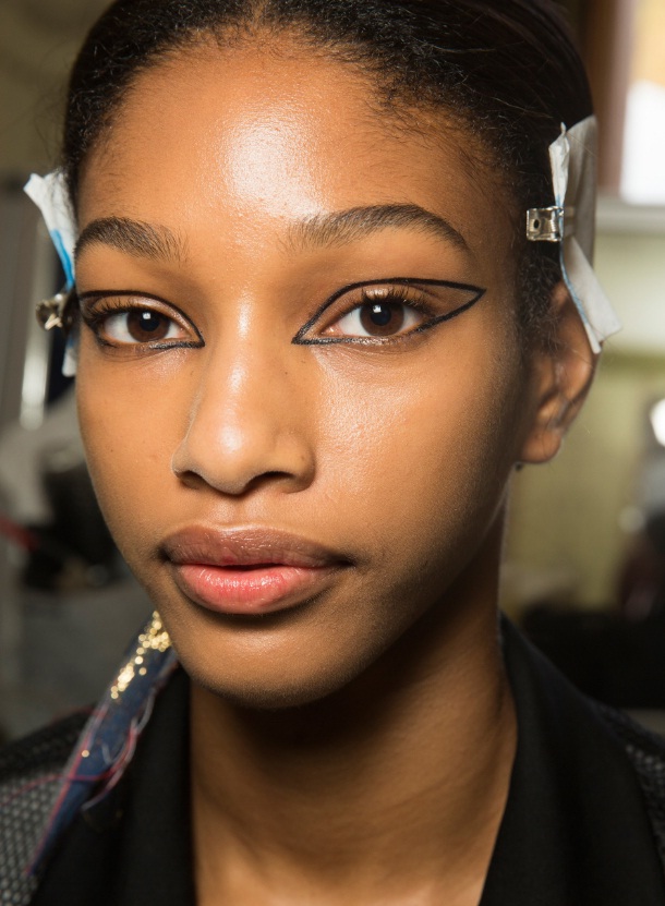 The Rochas look transformed black eyeliner into something of graphic art, with bold lines drawn in that cleanly traced the eyes. The unconventional and artsy eye makeup look was paired with pale pink lips, smooth skin and thick, natural-looking brows. With eyes that were so magnetic and oddly chic, there was certainly no need for layers of makeup or a vibrant lip!
