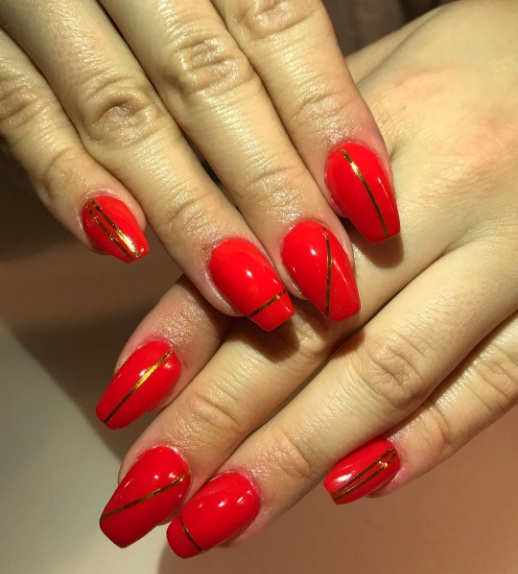 Gold stripes on bright red nails: Try refreshing your fingertips with a punchy scarlet shade that can instantly evoke warmth and passion. Meanwhile, topping off your nails with thin gold striping tape can effortlessly contrast against the red nail colour.