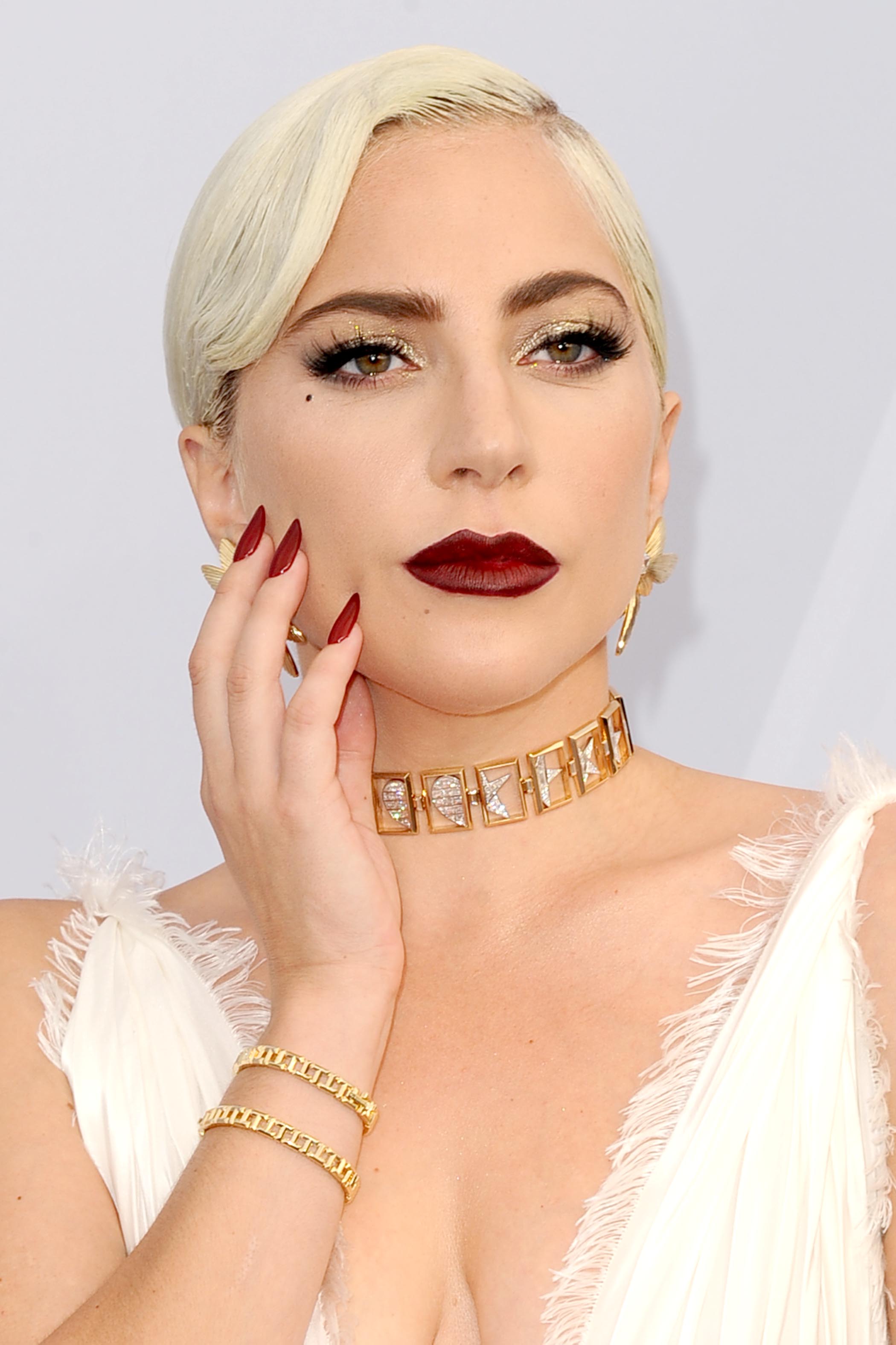 Lady Gaga rocked the red carpet with a 1920’s inspired updo, dark cherry lip colour and matching nails.