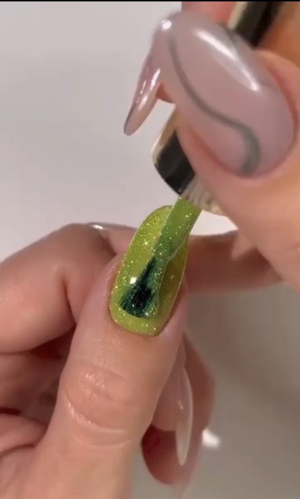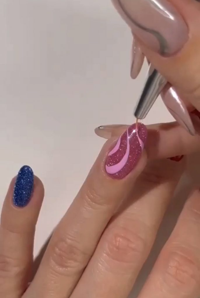 Start with clean hands and nails. Pat dry. Put on the sparkly nail polish colour first and let dry. Then add a little thin ‘swirl’ as an accent colour on top.