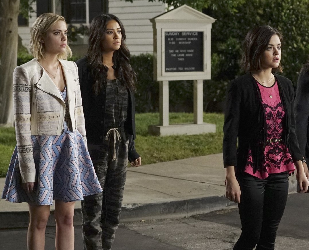 1) The playful patterns and cropped jackets from “Songs of Experience”: In Episode 2 of Season 6, the four friends prove that bold patterns can be easily styled with neutral layering pieces. We are loving Hanna’s funky pastel blue and pink printed frock, which was paired with a contrasting creamy white patterned bomber jacket. Meanwhile, Emily was a statuesque sight in her boyish camouflage print jumpsuit and versatile black jacket. Staying true to her signature girlish style, Aria made a splash in her pink and black peplum blouse with lacy detail. For a finishing touch, her basic black pants and cardigan emphasize the ladylike print.