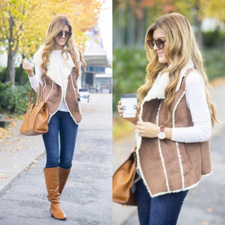 3) Layer a light suede vest over a knitted sweater: For warmer days where a parka jacket isn’t needed, sport a suede vest with shearling lining and collar for a chic everyday style that will take your winter ensemble to spring fashion. The light layer is a great way to complete a look while still adding some structure to a basic wardrobe. Layer it over a long sleeved-tee and dark-washed denim for a casual outfit or over a fitted knitted sweater dress paired with some black stockings and over-the-knee black leather boots for a cool, modern vibe you can rock into the evening.