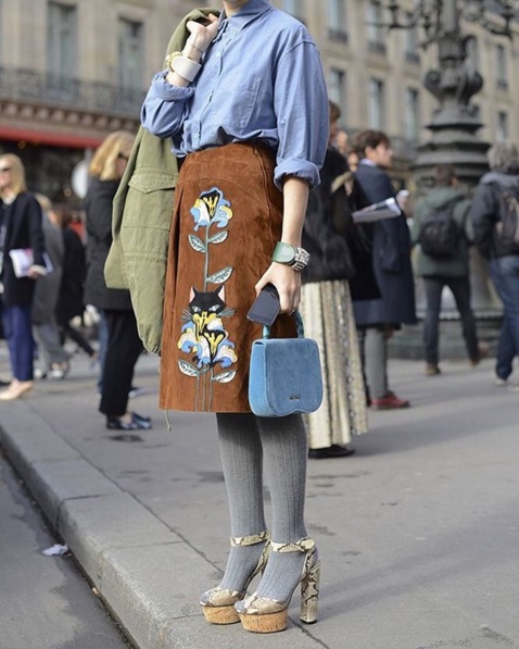 1) Try a suede skirt with an embroidered detail: Show some leg for spring and trade your plain black slacks for a chic, figure-flattering suede skirt to freshen up your nine to five daytime look. A warm caramel-coloured skirt with an A-line silhouette and tea-length hemline will add a modern twist to your office wardrobe. Go for a skirt with an embroidered detail like a floral print for a touch of a feminine accent to contrast the warm hue of the skirt. Accessorize with a pair of knitted grey hosiery and cream stilettos to keep your legs warm throughout the day.
